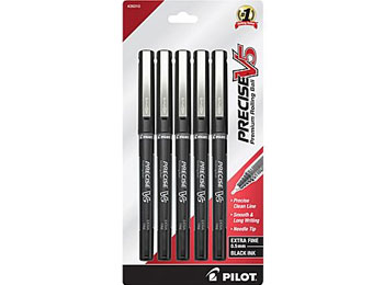 With a striking modern design, the patented Precise V5/7 precision point delivers incredibly smooth skip free writing in a range of stunning colors. Extra Fine point, 0.5mm Black Ink Unique liquid ink formula maintains consistent flowing strokes Black Barell Visible ink supply lets you see how much ink is left 5 per pack