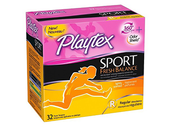 Flexible, comfortable and absorbent, these Playtex Sport Fresh Balance tampons are designed to neutralize odors for ultimate freshness and are a great solution for women with an active lifestyle.? The 32-pc box includes regular absorbency tampons with 360? Sport Level Protection.? FlexFit interlocking fibers trap leaks effectively, while a unique tapered design moves with your body.? A contoured applicator is slimmed at the tip for easy insertion, and a flared plunger with 3-ring finger grip assures no-slip handling.? The perfect feminine product to throw in your gym bag!