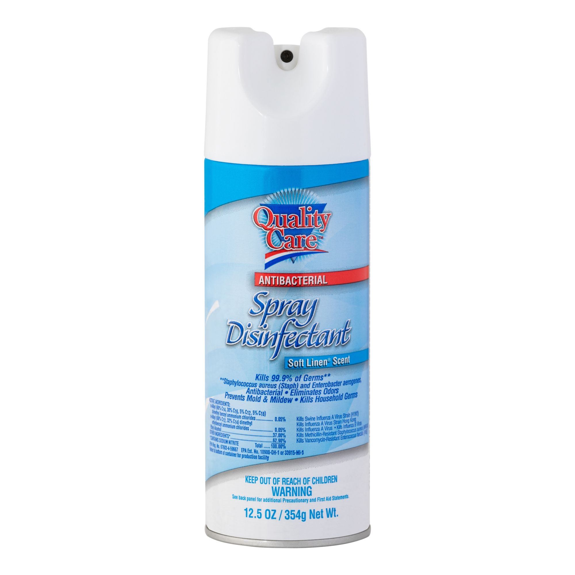 Spray Disinfectant, Kills 99.9% of Germs**, **Staphylococcus aureus (Staph) and Enterobacter aerogenes, Antibacterial, Eliminates Odors, Prevents Mold & Mildew, Kills Housed Germs, Included on EPA List N, products on this list meet EPA’s criteria for use against SARS-CoV-2, the virus that causes COVID-19. **Staphylococcus aureus (Staph) and Enterobacter aerogenes Product Features: Kills 99.9% of Germs** Included on EPA List N, products on this list meet EPA’s criteria for use against SARS-CoV-2, the virus that causes COVID-19. Eliminates Odors Kills Household Germs Kills Swine Influenza A Virus Strain (H1N1) Kills Methicillin-Resistant Staphylococcus aureus (MRSA) Kills Influenza A Virus and B Virus Prevents Mold & Mildew Ingredients: Active Ingredients: n-Alkyl (60% C14, 30% C16, 5% C12, 5% C18) dimethyl benzyl ammonium chloride ……………. 0.05% n-Alkyl (68% C12, 32% C14) dimethyl ethylbenzyl ammonium chloride ………………………………. 0.05% Ethyl Alcohol ……………………………………………………………………………………………………………… 37.00% Other Ingredients* ……………………………………………………………………………………………………….. 62.90% *Contains Sodium Nitrite Total ……………………………………………………….. 100.00% Product Warnings and Restrictions: Keep Out of Reach of Children WARNING See back panel for additional Precautionary Statements and First Aid. Precautions This product is not to be used as a terminal sterilant/high level disinfectant on any surface or instrument that (1) is introduced directly into the human body, either into or in contact with the bloodstream or normally sterile areas of the body, or (2) contacts intact mucous membranes but which does not ordinarily penetrate the blood barrier or otherwise enter normally sterile areas of the body. This product may be used to preclean or decontaminate critical or semicritical medical devices prior to sterilization or high level disinfection.First Aid If in Eyes: Hold eye open and rinse slowly and gently with water for 15-20 minutes. Remove contact lenses, if present, after the first 5 minutes, then continue rinsing eye. Call a poison control center or doctor for treatment advice. Have the product container or label with you when calling a poison control center or doctor or going for treatment. For emergency medical information call 1.800.222.1222.PRECAUTIONARY STATEMENTS Hazards to Humans & Domestic Animals WARNING: Causes substantial, but temporary, eye injury. Do not get in eyes or on clothing. Wear protective eyewear. Thoroughly wash hands after using and before eating, drinking, chewing gum, using tobacco or using the toilet. Remove contaminated clothing and wash clothing before reuse. Physical or Chemical Hazards Contents under pressure. Do not use or store near heat or open flame. Do not puncture or incinerate container. Exposure to temperatures above 130?F may cause bursting. Do not use on polished wood, painted surfaces, leather, rayon fabrics, acrylic plastics or furniture.