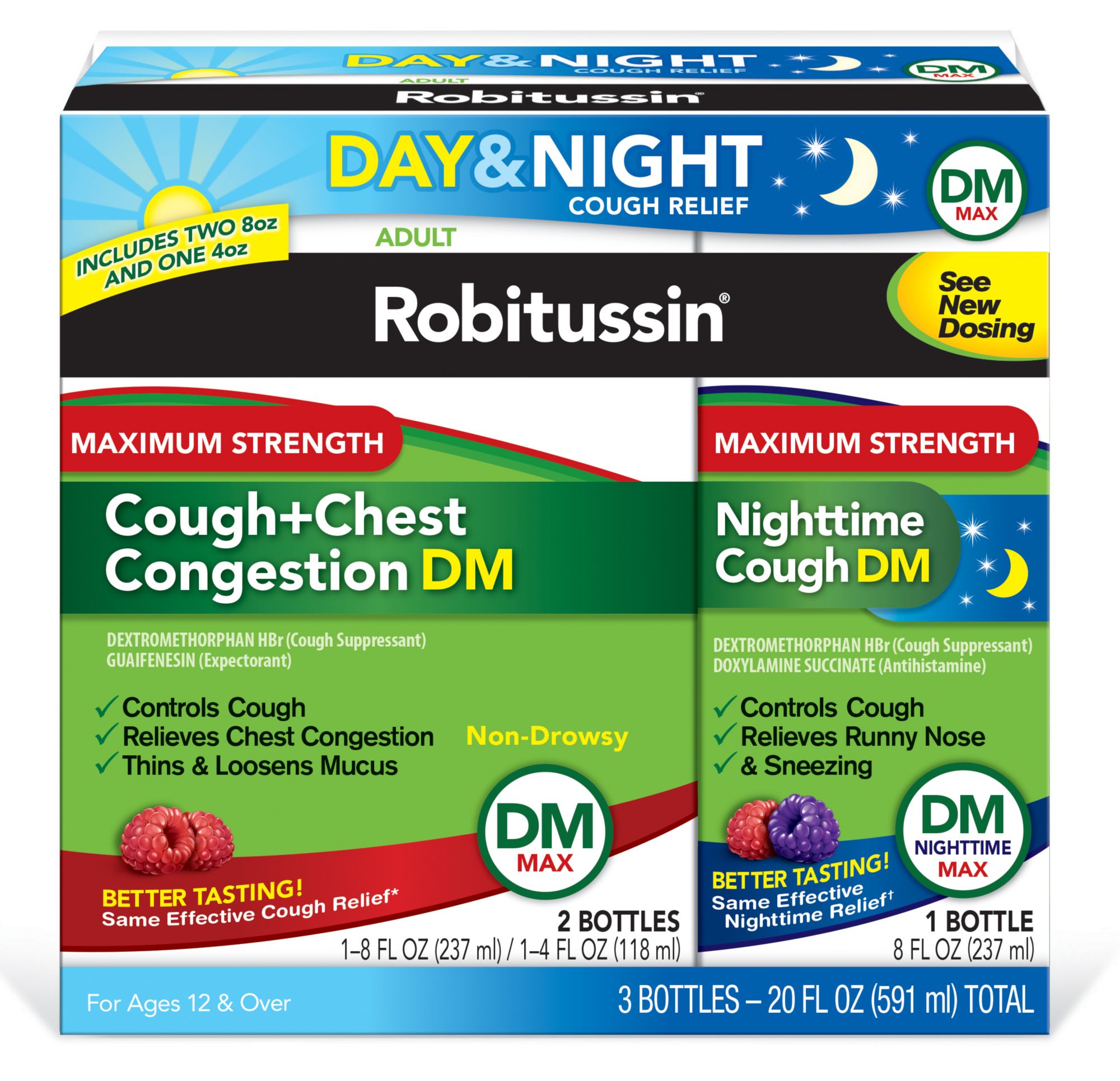 Because your cough never takes a break, neither does Robitussin’s Maximum Strength DM Day and Night Pack. Now you can conveniently control your cough day and night, with all the power of DM Max cough liquids from Robitussin. Product Features: The #1 pharmacist-recommended brand for cough, cold and flu combinations Control your cough with all the power of Robitussin’s maximum strength DM cough liquid Maximum strength nighttime formula controls your cough to help you sleep Relieves cough, itchy throat, running nose Includes 20 Oz. of syrup (Model 209331)