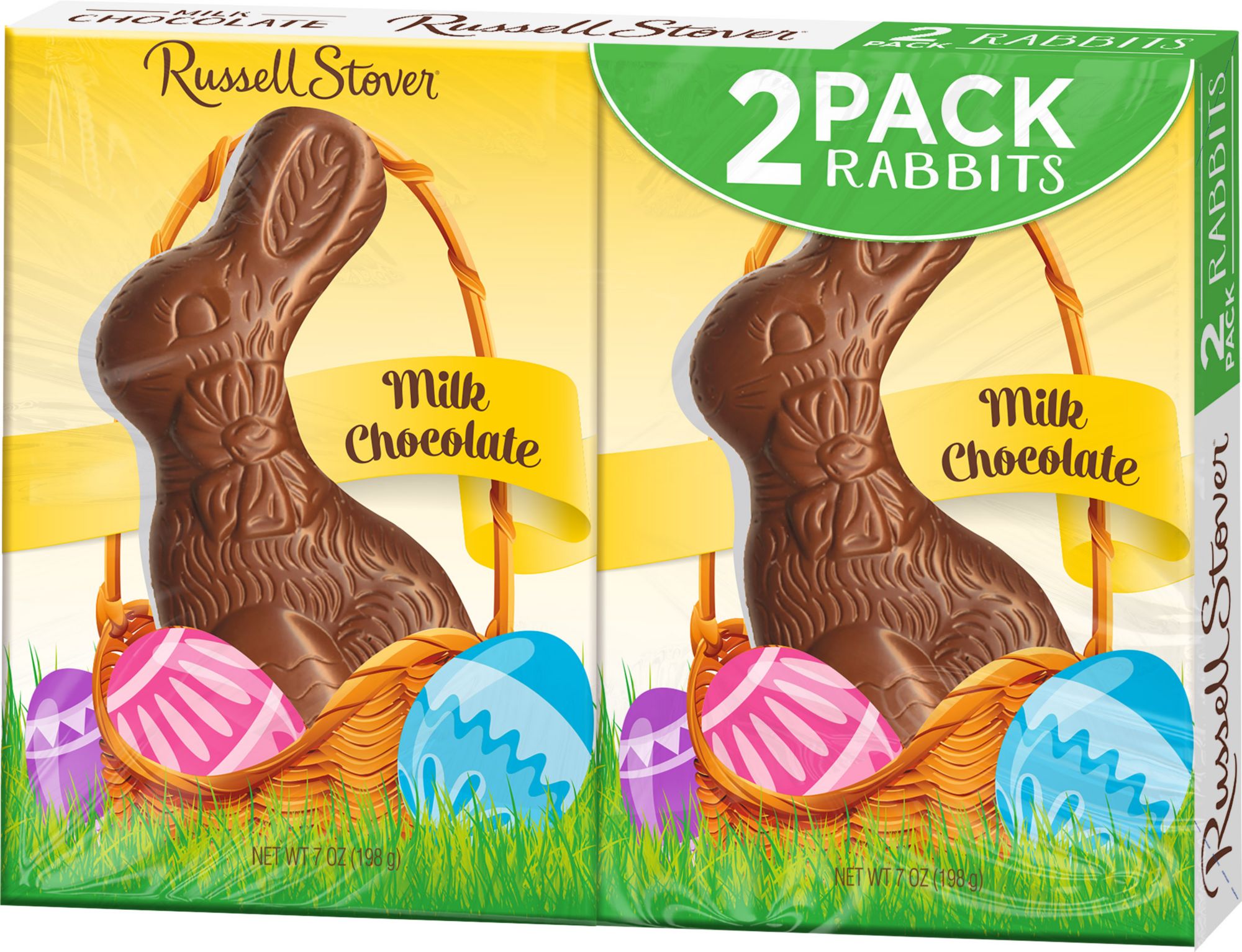 Made in USAEnjoy delicious Russell Stover Milk Chocolate Rabbits in a covenant two-pack. Each chocolate bunny makes a perfect Easter basket gift. Product Features: Solid milk chocolateEaster giftsEaster basket itemMade in the USAIncludes two 7-oz. solid milk chocolate flat-back rabbits Product Warnings and Restrictions: Contains milk, soy, eggs and wheatMay contain tree nuts and peanuts (Model 6415)