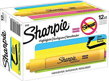 Yellow Sharpie Accent Highlighters- Highlight With Ease Yellow Chisel tip for both wide and narrow lines of text Smear Guard ink technology is specially formulated to resists smearing many pen and marker inks Easy gliding tip for smooth highlighting Large ink supply ensures a long marking life AP certified nontoxic Mark up anything with eye-catching yellow using these Sharpie accent highlighters. These markers are AP certified nontoxic for safety. Smear-Free Marks The ink in these highlighters is designed to resist smudging, so your marks will look great for years to come. The marker glides smoothly to avoid accidental unevenness. Versatile Tip Width The chisel tip lets you make the decision to create thick or fine lines, and you can even change the width while you write. To draw even more attention, pair this marker with a fluorescent pink highlighter. Always Available Each pack contains twelve yellow highlighters, so you can place them around the office and always have one at hand. The large ink supply in each marker means that you are unlikely to run out of ink in the middle of highlighting.