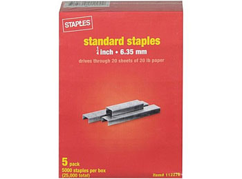 Staples Standard-size Office and Home Staples- Convenient, Reliable and Economical For use in all standard staplers 25,000/Box 1/4" leg length and beveled tips 210 staples per strip 5 boxes per pack Staples Brand 100% Satisfaction Guaranteed Staples standard-size staples are made for all standard-size hand and electric staplers. They are available in convenient, money-saving packages of 25,000 staples, so you’ll never run out. These quality staples are made to penetrate paper without jamming. Convenient Packaging Staples standard staples are packaged in handy packs, each of which contains five boxes of 5,000 staples each. You can give each member of your staff a box to keep on hand for quick stapler refills. Reliable and Sturdy Staples standard staples are made with beveled edges. This enables each staple to penetrate paper easily, without jamming your machine. Compatibility You can use Staples standard staples with all common office staplers, including both hand and electric staplers. Each staple has a 1/4-inch leg length, and each strip has 210 staples, so the staples conform to standard-size specifications. Staples Standard-size Office and Home Staples- Convenient, Reliable and Economical For use in all standard staplers 25,000/Box 1/4" leg length and beveled tips 210 staples per strip 5 boxes per pack Staples Brand 100% Satisfaction Guaranteed Staples standard-size staples are made for all standard-size hand and electric staplers. They are available in convenient, money-saving packages of 25,000 staples, so you’ll never run out. These quality staples are made to penetrate paper without jamming. Convenient Packaging Staples standard staples are packaged in handy packs, each of which contains five boxes of 5,000 staples each. You can give each member of your staff a box to keep on hand for quick stapler refills. Reliable and Sturdy Staples standard staples are made with beveled edges. This enables each staple to penetrate paper easily, without jamming your machine. Compatibility You can use Staples standard staples with all common office staplers, including both hand and electric staplers. Each staple has a 1/4-inch leg length, and each strip has 210 staples, so the staples conform to standard-size specifications.