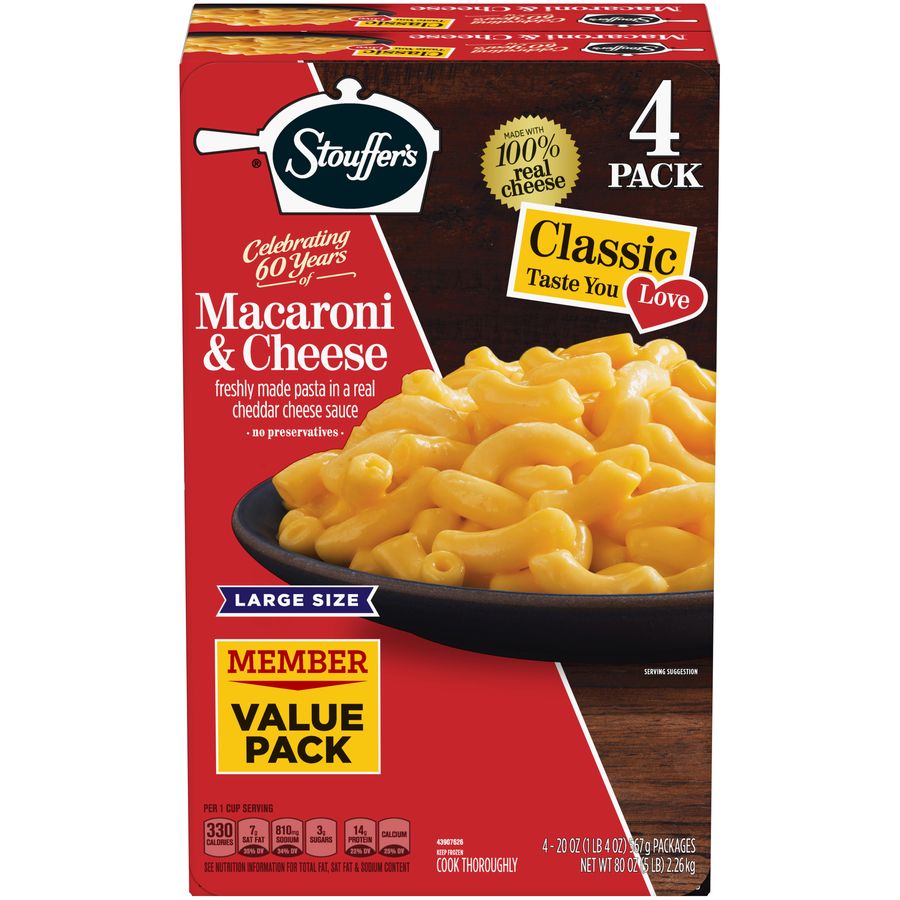 Stouffer’s Macaroni and Cheese pairs tender, freshly prepared elbow macaroni made from durum semolina wheat and blends it with creamy, sharp Cheddar cheese and a hint of sea salt. Stouffer’s Party Size Macaroni and Cheese is the perfect dish for any occasion. It is loaded with creamy cheese and hearty macaroni, making it a crowd-pleaser that’ll keep everyone coming back for more. Product Features: Freshly made pasta in a 100% cheddar cheese sauce Party size and perfect for any occasion A convenient over-proof tray makes for an easy cleanup Includes four Macaroni and Cheese dinners