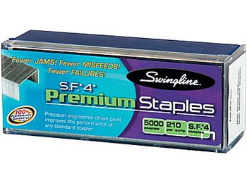 Swingline Premium Staples- Staple with industry leading S.F. 4 staples. For use with full strip staplers 5,000/Box in each reusable storage box Standard 1/4′ leg length Staples up to 20 sheets Precision engineered chisel point for minimal jamming 75% fewer misforms than comparable staples 210 staples per strip Chisel pointed for better penetration With the Swingline premium staples, you’ll have all the staples you need to handle your documents. Each package contains 5,000 staples in a handy reusable storage box, so you can easily store them in your desk or storage cabinet. Better Paper Penetration The Swingline premium staples are designed with chisel-point tips, so they’ll easily penetrate up to 20 sheets of paper. They also won’t jam in the stapler, so you can complete your job with fewer hassles. Fewer Misforms Because of the precision chisel points, the Swingline premium staples also have fewer misforms when stapling. You won’t end up with sharp points sticking out to snag fingers or clothing. Full Strips The Swingline premium staples come in full strips of 210 staples. They work with all standard, full-size staplers, including the Swingline deluxe full strip stapler.