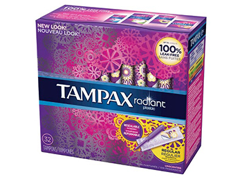 Tampax Radiant plastic, up to 100% Leak-Free ; 100% LEAK-FREE Periods Are Possible ; Up to 8 hours of comfortable leak-free protection.Use a maximum of 8 hours. ; LeakGuard braid helps stop leaks before they happen. ; CleanSeal re-sealable wrapper for quick and easy discreet disposal.