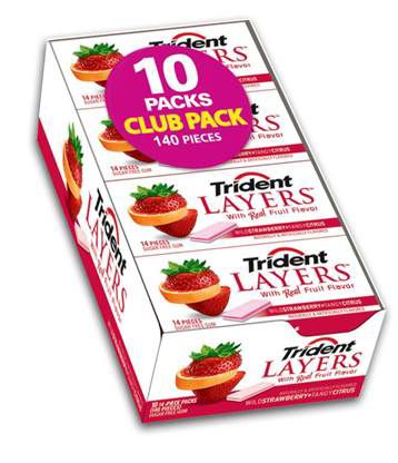Trident Layers Sugar-Free Wild Strawberry & Tangy Citrus Gum features real fruit flavors for a burst of sweetness. This gum is also sugarfree, meaning fewer calories than your average sugared gum. This club pack includes 140 pieces of Trident Layers gum. Product Features: Real fruit flavorsSugar-freeStrawberry & Tangy Citrus flavorIncludes ten 14-piece packs (Model 125460000000)