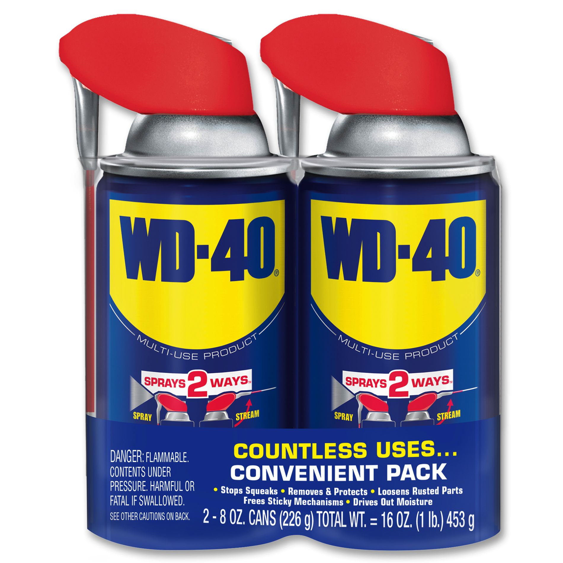 WD-40 Multi-Use Product protects metal from rust and corrosion. It also penetrates stuck parts. You can also use it to displace moisture, as it lubricates almost anything. Product Features: Stops squeaksLubricatesDrives out moistureLoosens rusted partsSmart Straw sprays two ways50-State VOC compliantIncludes two 8-oz. cans