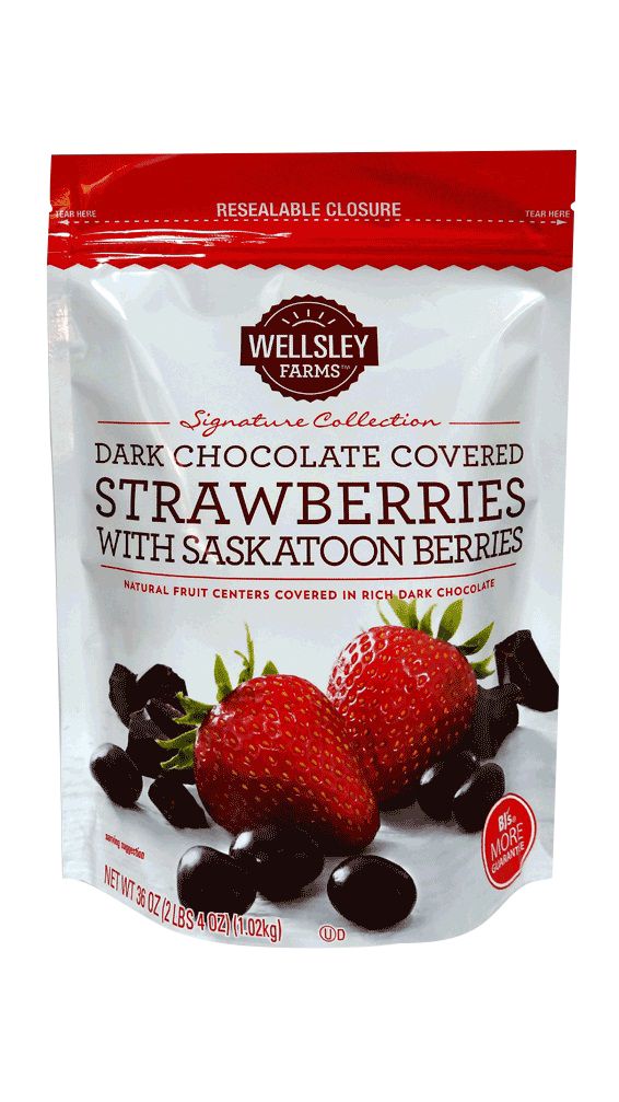 Made in USAThese dark chocolate-covered strawberries contain Saskatoon berries with a real fruit center. Saskatoon berries are a high source of fiber and contain 5 essential vitamins and minerals required to maintain a healthy diet, so you can indulge in chocolate while enjoying one of nature’s superfruits. Product Features: Contains real fruit, not just juicesChocolate contains vanilla extract, not just natural flavorsMilk-freeContains “superfruits”Saskatoon berries are a high source of fiber5 essential vitamins and minerals required to maintain a healthy dietKosherIncludes 36 oz. of dark chocolate-covered fruit (Model 2010) Product Warnings and Restrictions: Produced on equipment that processes milk, tree nuts (almonds and pistachio), peanuts and wheatMade in the USAShelf life: 12 months