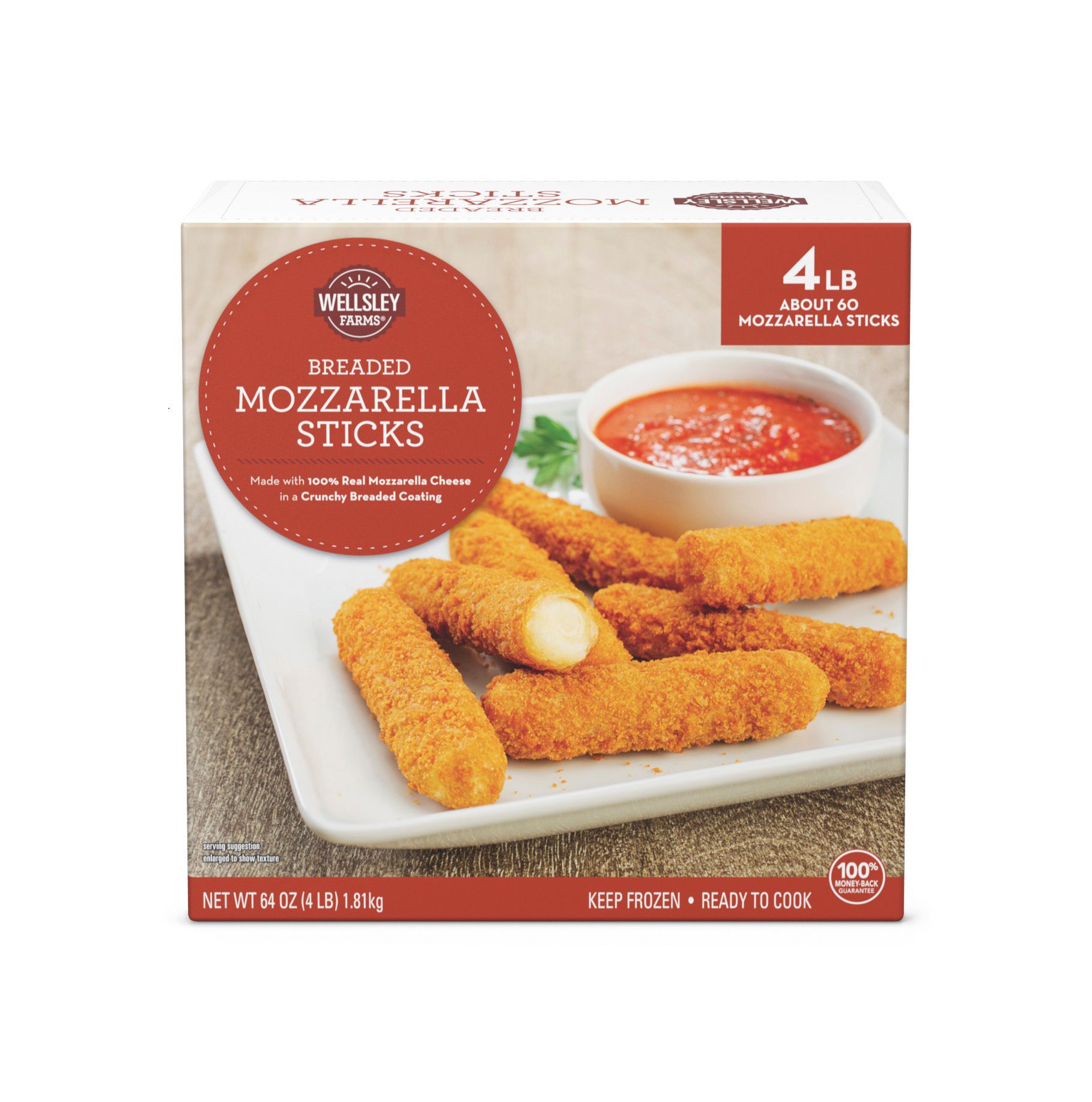 Made in USAEnjoy mozzarella sticks anytime with two 2 lb. bags from Wellsley Farms. A crunchy breaded coating coats 100% real mozzarella for a delicious party favorite. Easy to prepare they go straight from the freezer right into the oven, perfect appetizer or snack for any occasion. Product Features: Made with 100% real mozzarellaCrunchy breaded coatingParty favoriteGreat snack item for kidsIncludes two 2 lb. bags of mozzarella sticks (Model 37723) Product Warnings and Restrictions: Contains milk and wheat.