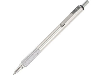 Retractable pen is made of professional-grade stainless steel from tip to cliprr0.7mm ballpointrBlack inkrEasy-to-hold knurled metal grip provides writing stabilityrQuiet plunger mechanism silences any clicking when you retractrDesigned to prevent corrosionrRefillable with Zebra F-RefillrEach