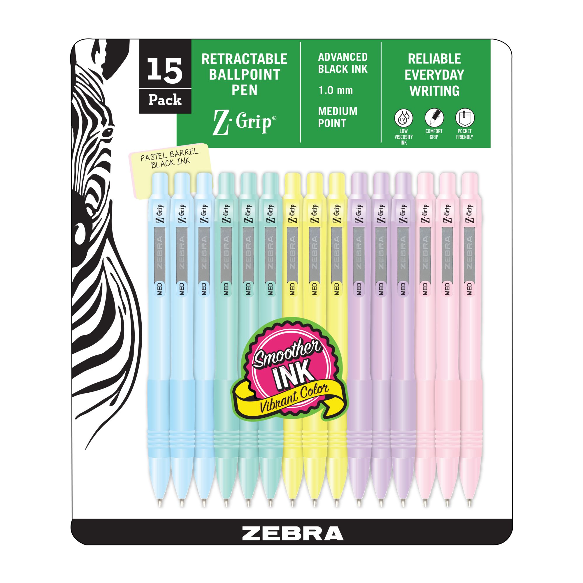 Zebra’s bestselling Z-Grip Retractable pen is now available in muted pastel barrels with black ink. This medium point pen features the same super smooth low viscosity ink that glides across the page, latex-free rubberized and ridged grip, and secure metal clip. Each pack comes available in five mild barrel colors: Blue, Green, Yellow, Violet, and Pink, with each pack containing three of each color. Product Features: Three of each pastel barrel: Blue, Green, Yellow, Violet, and Pink Muted, mild, pastel barrels with black 1.0mm ink (medium point size) Super smooth low viscosity ink, also called advanced ink Latex-free rubberized grip and metal clip Includes 15 pens (three of each pastel barrel: Blue, Green, Yellow, Violet, and Pink)
