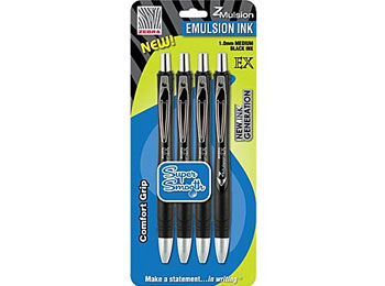 New Ink Generation – The best of a ballpoint & gel!rrZebra‚Äôs new Emulsion Ink system is the 4th generation ink formulated by Zebra¬Æ Pen. The Emulsion ink is a formulation of water and oil giving brilliant writing lines, quick-drying, no fade out, and the best of a ballpoint and gel pen has to offer.rrMedium Point, 1.0mmrBlack inkrSuper smooth ink gliderTrendy, solid contoured barrelrRubber grip for writing comfortrSilver imprinted accentsrNon-refillabler4 per pack