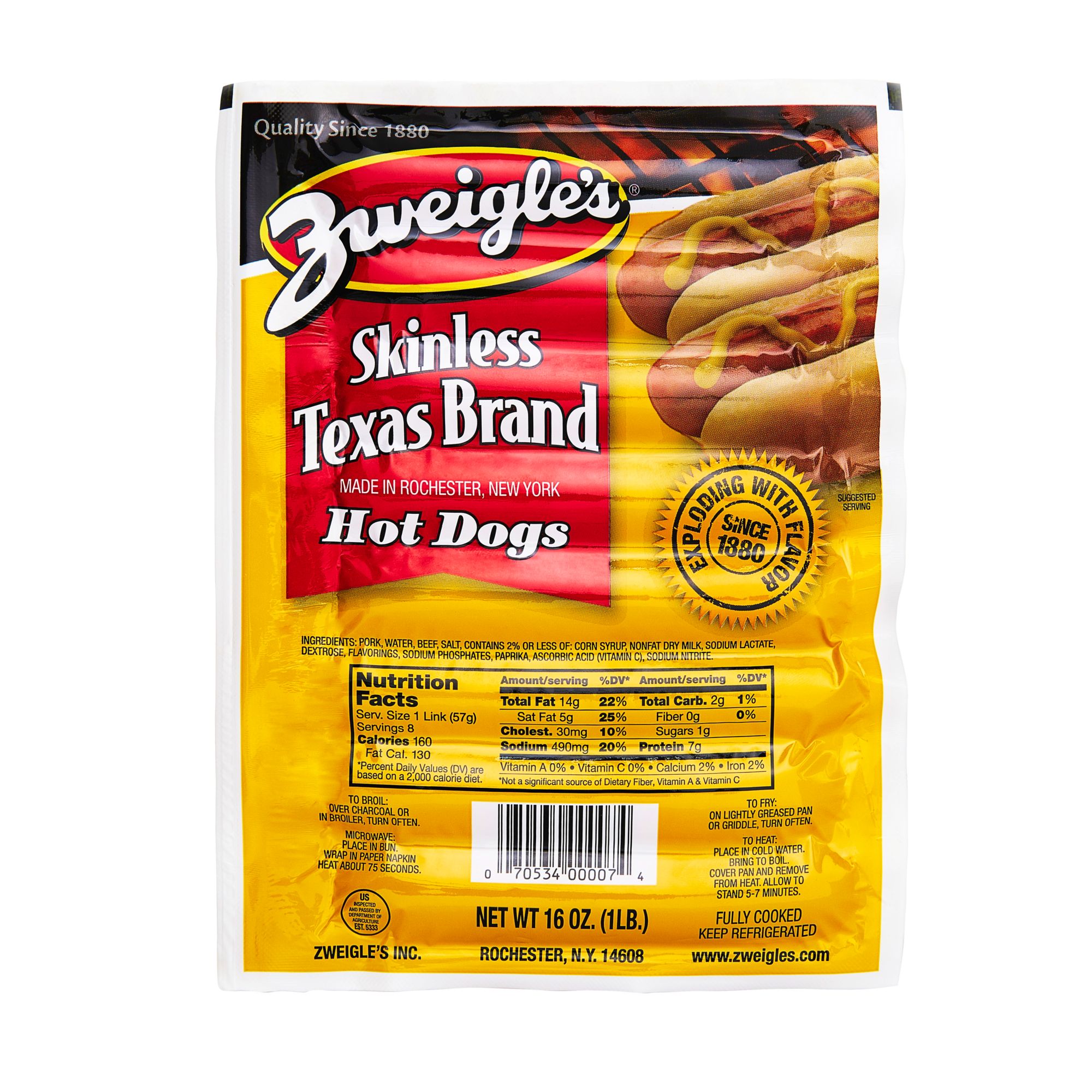 Zweigle’s Skinless Texas Frank is a pork and beef hot dog blended with a unique spice. Since 1880, when C. Wilhelm and Josephine Zweigle opened their butcher shop in Rochester, New York, the company has been focused on quality and committed to making great meals quick and easy for busy families. Producing premium quality, great tasting products has been the foundation of Zweigle’s success ever since. These products never contain mechanically separated chicken or fillers. Every product made is produced from specially selected, fresh whole muscle meats, ground on-site. Today, Zweigle’s combines “Old World” family recipes and artisan craftsmanship with state of the art technology to optimize product quality, safety and consistency. From the flagship Pop Open hot dogs to the newest gourmet creations, all Zweigle’s products are backed by an unwavering commitment to quality and comprehensive food safety plan. Zweigle’s is a fifth-generation, family and woman owned business. Product Features: 8 units per case, with 24 hot dogs in each package Gluten free Family friendly Easy to cook Fully cooked Ingredients: Pork, Water, Beef, Contains 2% or less of: Corn Syrup, Nonfat Dry Milk, Sodium Lactate, Dextrose, Flavoring, Sodium Phosphates, Paprika, Ascorbic Acid (Vitamin C), Sodium Nitrite. Product Warnings and Restrictions: Contains pork and milk.